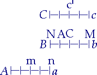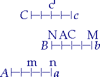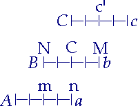 Wenn auf einem bestimmten Raum, z. B. einer Tafel (Aa), zwei mit dieser und untereinander gleich lange Körper, der eine (Bb) mit einem seiner Enden (B) auf der Mitte (m) der Tafel liegt, der andere (Cc) in derselben Richtung nur das Ende (n) der Tafel berührt, und sie sich in entgegengesetzter Richtung bewegen und jener (Bb) z. B. in einer Stunde das Ende (n) der Tafel erreicht, so geschieht, daß der eine (Cc) in der Hälfte der Zeit denselben Raum (CN) durchläuft, den (mn) der andere in der doppelten; die Hälfte ist also dem Doppelten gleich. Nämlich "dieser zweite (c') kommt an dem ganzen ersten (Bb) vorbei". In der ersten halben Stunde läuft c' von M bis C: