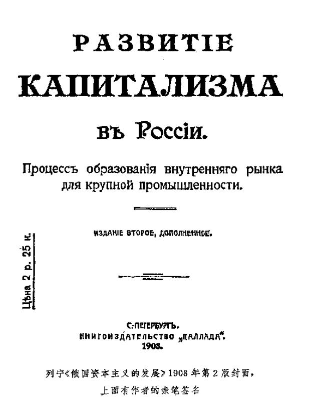 1 《俄国资本主义的发展(大工业国内市场形成的过程)》一书写于1895年底―1899年1月,这正是列宁因彼得堡工人阶级解放斗争协会案件在彼得堡被捕和被流放到西伯利亚舒申斯克村的时期。为了撰写这一著作,列宁查考了有关俄国经济的全部重要文献,阅读和研究了大量的书刊,包括卷帙浩繁的各种统计资料,仅他在本书中提到和引用的著作就有近600种。这些书籍和资料是列宁在被监禁和流放的困难条件下通过各种渠道、首先是通过亲友的协助收集到的。列宁于1898年8月9日(21日)写完本书的初稿,然后又进一步加工,于1899年1月30日(2月11日)完成全书的定稿。在撰写过程中,每一章的手稿都经当时流放在米努辛斯克专区的社会民主党人阅读和讨论过。本书的出版事务,列宁委托给了当时住在莫斯科的姐姐安·伊·乌里扬诺娃-叶利扎罗娃。为争取时间,列宁决定采取分批付排的办法。对书的开本、字号和书中统计表的排版等,列宁都从方便读者的角度作了仔细的考虑。他尤其关心校对工作。本书的书名是在出版时确定的。列宁同意把自己原拟的书名作为副标题,同时认为“俄国资本主义的发展”这个题目太大,曾建议用“关于俄国资本主义发展的问题”作书名。1899年3月底,本书在彼得堡出版,署名:弗拉基米尔·伊林。初版印了2400册,很快就销售一空。当时它主要是在社会民主党的知识分子和青年学生中传播,同时也通过宣传员在工人小组中传播。1908年,本书经列宁校阅和补充后出了第2版。本卷翻译所依据的《列宁全集》俄文第5版第3卷以第2版为底本,同时考虑了作者对第1版的所有意见。列宁为第2版所写的序言同第1版序言一起收进了本卷。——1。