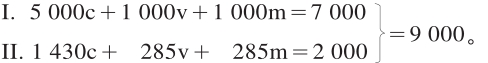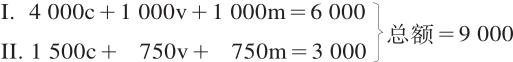 在五年规模扩大的再生产期间,第I部类和第II部类的总资本,已经由5 500c+1 750v=7 250,增加到8 784c+2 782v=11 566,也就是按100∶160之比增加了。总剩余价值原来是1 750,现在是2 782。已经消费的剩余价值,原来在第I部类是500,在第II部类是600,合计=1 100;但是在最后一年,在第I部类是732,在第II部类是745,合计=1 477,因此,是按100∶134之比增加了。108