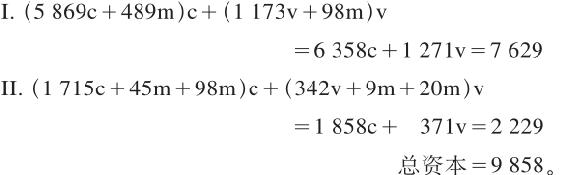108 在《资本论》第二卷第一版(1885年)和第二版(1893年)中,这段话是这样的:“在四年规模扩大的再生产期间,第I部类和第II部类的总资本,已经由5 400c+1 750v=7 250增加到8 784c+2 782v=11 566,也就是按100∶160之比增加了。总剩余价值原来是1 750,现在是2 782。已经消费的剩余价值,原来在第I部类是500,在第II部类是535,合计=1 035;但是在最后一年,在第I部类是732,在第II部类是958,合计=1 690。因此,是按100∶163之比增加了。”