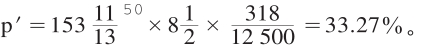 可见,每周预付的流动资本=358c+52v=410;它的百分比构成=87.3c+12.7v。按全部流动资本2 500镑计算,就是2 182镑不变资本和318镑可变资本。因为一年的工资总支出等于52镑的52倍,即2 704镑,所以318镑可变资本在一年内几乎正好周转8(1/2)次。剩余价值率为80/52=153(11/13)%。根据这些要素,把m′=153(11/13),n=8(1/2),v=318,C=12 500这几个数值代入p′=m′nv/C公式,我们就可以算出利润率如下: