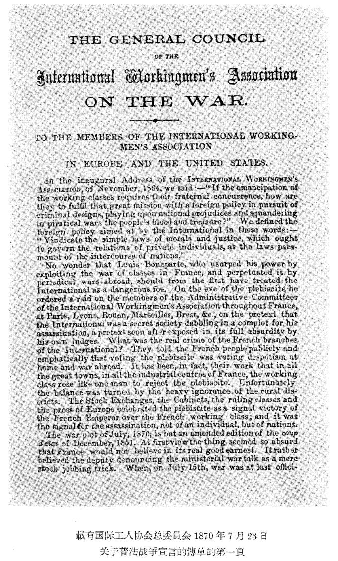 宣言用法文发表于1870年8月“平等报”、1870年8月7日“国际报”第82号和1870年8月7日“米拉波报”第55号。宣言也用总委员会所设委员会译成的法文以传单形式出版。
