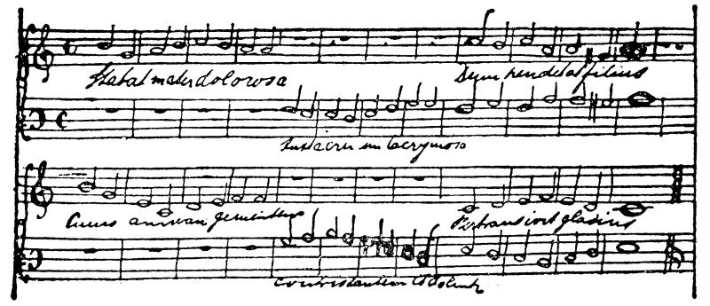 伴奏曲尚未写成,我以后可能还要做些改动。一看便知,除第四行以外,大部分都抄自赞美诗集。歌词是著名的拉丁文赞美诗:“Stabat mater dolorosa Juxta crucem lacrymosa Dum pendebat filius”FN1。