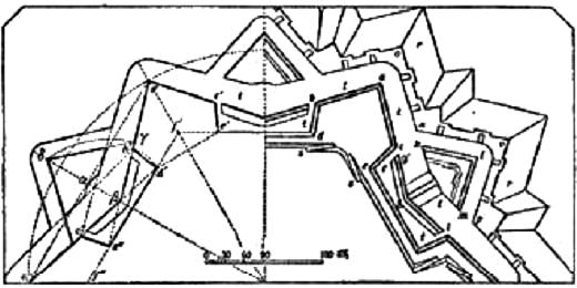 图1所示的是根据沃邦的第一种方法建成的六角形要塞的前三面。左半图是工事外形的几何草图,右半图是详细画出的土堤、斜堤和其他部分。多角形要塞的f′f″线并不全部是连续的土堤,其两端d′f′和e″f″部分没有土堤,这段空间由向前突出的五角形棱堡d′b′a′c′e′掩护。a′b′线和a′c′线构成棱堡的正面;b′d′线和c′e′线构成棱堡的侧面;棱堡正面和侧面交会之点叫交点。从圆心到棱堡顶角的a′f′线叫中线。六角形始边的一段——e″d′线是中堤。这样,每一座多角形要塞有多少个边,就有多少个棱堡。棱堡有实心的和空心的两种:五角形棱堡内全部填土,填到架炮垒道(土堤上放置火炮的地点)的高度时,叫实心棱堡;土堤从垒道后面起就向棱堡内部成缓坡倾斜时,叫空心棱堡。图1中dbace为实心棱堡,其右面只画出一半的是空心棱堡。棱堡和中堤合在一起组成要塞的围墙,即要塞的核心部分。在棱堡和中堤上,我们首先看到的是架炮垒道上的胸墙,胸墙构筑在前面,以便掩护防守者,其次可看到内斜面上的坡道(ss),这是用以和要塞内部保持交通的。要塞围墙的高度足以掩护城内房屋不受敌人平射火力的射击,而胸墙的厚度则足以长时间经受住重炮的轰击。整个要塞围墙的周围有护城壕tttt,护城壕内配置有几种外围工事。首先,中堤前有三角堡或半月堡klm——一种有两个正面kl和lm的三角形工事,每个正面都有配置火炮的土堤和胸墙。上述一切工事敞开的后面部分叫背面,所以三角堡的km线和棱堡的de线都是背面。三角堡的胸墙比要塞核心部分的胸墙约低3—4英尺,这样,后者便可瞰制三角堡的胸墙,必要时,要塞核心部分的火炮可超越三角堡进行射击。中堤和三角堡之间的护城壕内,有一种狭长的独立工事ghi叫做凹角堡,主要用来掩护中堤,使它不受敌人破城炮的射击。这种工事很低而且过于狭窄,不能配置火炮,其胸墙仅能在敌人强攻得利的时候,使步兵能从护城壕中进行射击,从翼侧掩护半月堡。护城壕外面是隐蔽路nop,它的内侧是护城壕,外侧是斜堤rrr的内斜面,斜堤从自己的内缘即斜堤顶(crête)起成极缓的斜坡向堤外地面倾斜。斜堤顶又比三角堡低3英尺或3英尺以上,以便要塞的全部火炮都能超越它而进行射击。在这些土质工事的斜面中,要塞核心部分的外斜面和护城壕内的外围工事的外斜面(即内岸),以及护城壕本身的外斜面(从隐蔽路向下的部分),即外岸通常都用石砌。隐蔽路的凸角和凹角构成的宽大的掩蔽地点叫屯兵场,在凸角处的叫凸角屯兵场(如o),在凹角处的叫凹角屯兵场(如np)。为了防止对隐蔽路的纵射,隐蔽路上每隔一定距离拦起一道横墙,即横方向的胸墙,只在靠近斜堤的一端留一个不大的通路。有时还构筑小型工事,用来掩护从凹角堡通过护城壕到三角堡的交通。这种工事叫侧防暗堡,是一条两面用胸墙掩护的狭窄的通路,胸墙的外部表面成缓坡向下倾斜,和斜堤相似。图1中这种侧防暗堡位于凹角堡ghi和三角堡klm之间。
