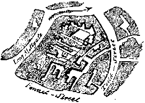 Es wird am Orte sein, hier einige allgemeine Bemerkungen über die in Manchester übliche Bauart der Arbeiterviertel zu machen. Wir haben gesehen, wie in der Altstadt meist der reine Zufall über die Gruppierung der Häuser verfügte. Jedes Haus ist ohne Rücksicht auf die übrigen gebaut, und die winkligen Zwischenräume der einzelnen Wohnungen werden in Ermangelung eines andern Namens Höfe (courts) genannt. In den etwas neueren Teilen desselben Viertels und in andren Arbeitsvierteln <(1892) Arbeitervierteln>, die aus den ersten Zeiten der aufblühenden Industrie herrühren, finden wir ein etwas planmäßigeres Arrangement. Der Zwischenraum zwischen zwei Straßen wird in regelmäßigere, meist viereckige Hofe geteilt, etwa so: