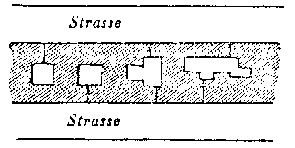 In späterer Zeit hat man eine andre Bauart angefangen, die jetzt die allgemeine ist. Die Arbeitercottages werden jetzt nämlich fast nie einzeln, sondern immer dutzend-, ja schockweise gebaut - ein einziger Unternehmer baut gleich eine oder ein paar Straßen. Diese werden dann auf folgende Weise angelegt: Die eine Front - vgl. die Zeichnung unten - bilden Cottages ersten Ranges, die so glücklich sind, eine Hintertür und einen kleinen Hof zu besitzen, und die die höchste Miete bringen. Hinter den Hofmauern dieser Cottages ist eine schmale Gasse, die Hintergasse (back street), die an beiden Enden zugebaut ist und in die entweder ein schmaler Weg oder ein bedeckter Gang von der Seite her führt. Die Cottages, die auf diese Gasse führen bezahlen am wenigsten Miete und sind überhaupt am meisten vernachlässigt. Sie haben die Rückwand gemeinsam mit der dritten Reihe Cottages die nach der entgegengesetzten Seite hin auf die Straße gehen und weniger Miete als die erste, dagegen mehr als die zweite Reihe tragen. Die Anlage der Straßen ist also etwa so: