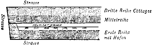 Durch diese Bauart wird zwar für die erste Reihe Cottages eine ziemlich gute Ventilation gewonnen und die der dritten Reihe wenigstens nicht gegen die der entsprechenden in der frühern Bauart verschlechtert; dagegen ist die Mittelreihe mindestens ebenso schlecht ventiliert wie die Häuser in den Höfen und die Hintergasse selbst stets in demselben schmutzigen. und unansehnlichen Zustande wie jene. Die Unternehmer ziehen diese Bauart vor, weil sie ihnen Raum spart und Gelegenheit gibt, die besser bezahlten Arbeiter durch höhere Miete in den Cottages der ersten und dritten Reihe desto erfolgreicher auszubeuten.