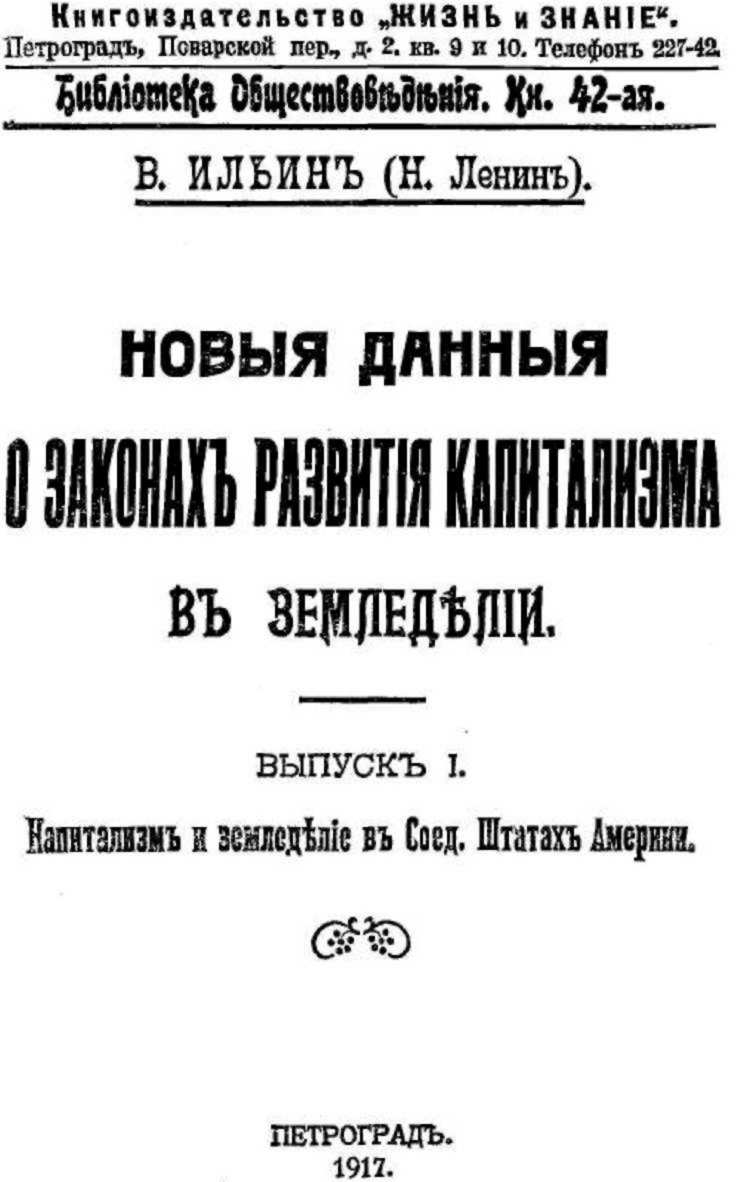 Обложка книги В. И. Ленина «Новые данные о законах развития капитализма в земледелии.