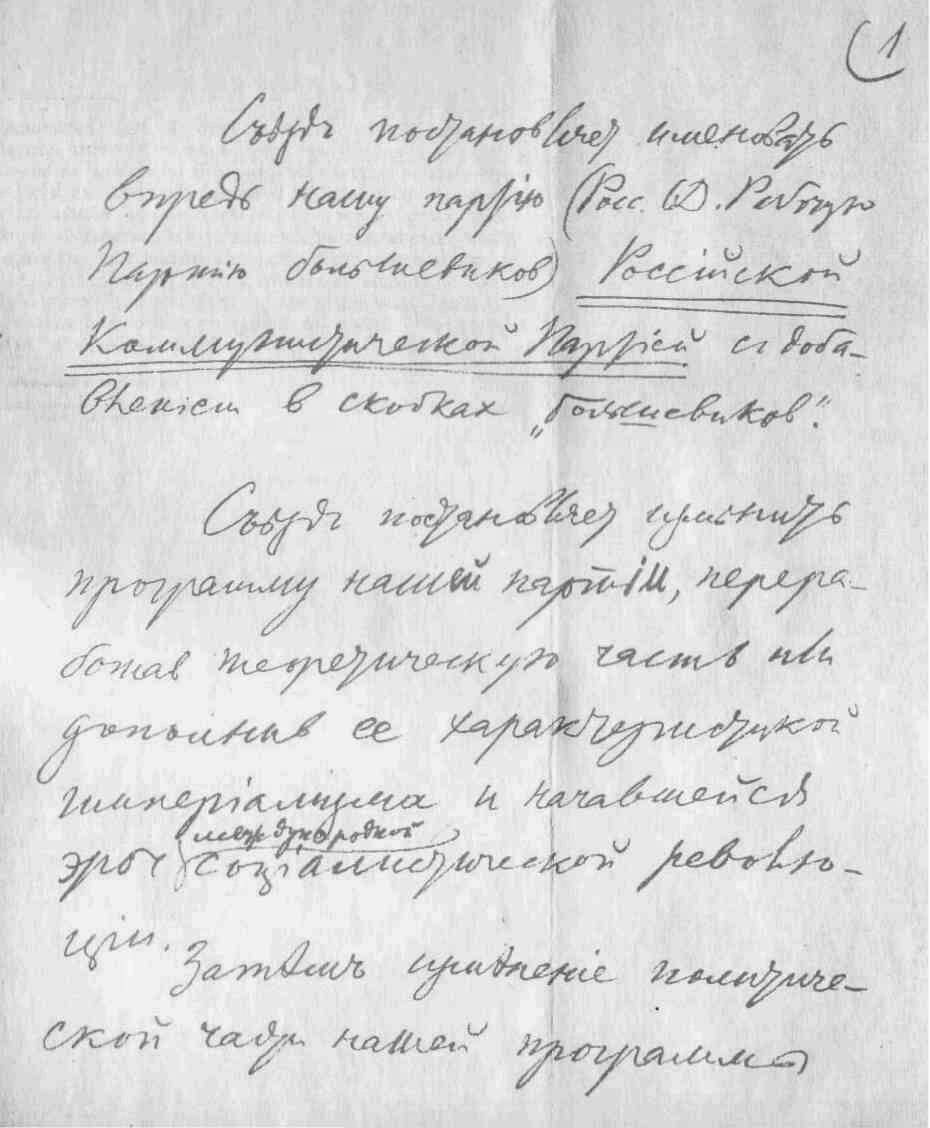 Первая страница рукописи В. И. Ленина «Резолюция об изменении названия партии и партийной программы». - Март 1918 г. 58-59
